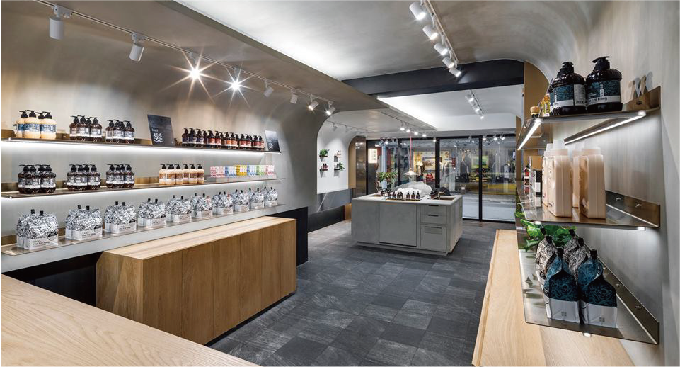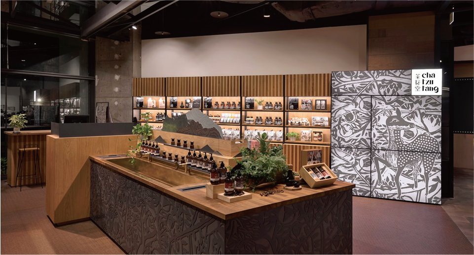 茶籽堂的三個重要據點,承襲從土裡長出來的品牌精神,各自展現不同的氣質與調性,格子跳脫「只是做室內設計」的思維,巧妙運用設計和策展觀點,揉合現代創意和傳統工藝,讓臺灣的材料與工法為自己發聲,例如創作出磁磚版畫招牌、雪山山脈3D列印模型、回收玻璃燈罩,搭配碧綠植栽和珍貴原木,營造出自然的原始氛圍,當消費者走到店內時,藉由感官的觸發,可以深入感受人與土地的真實連結。