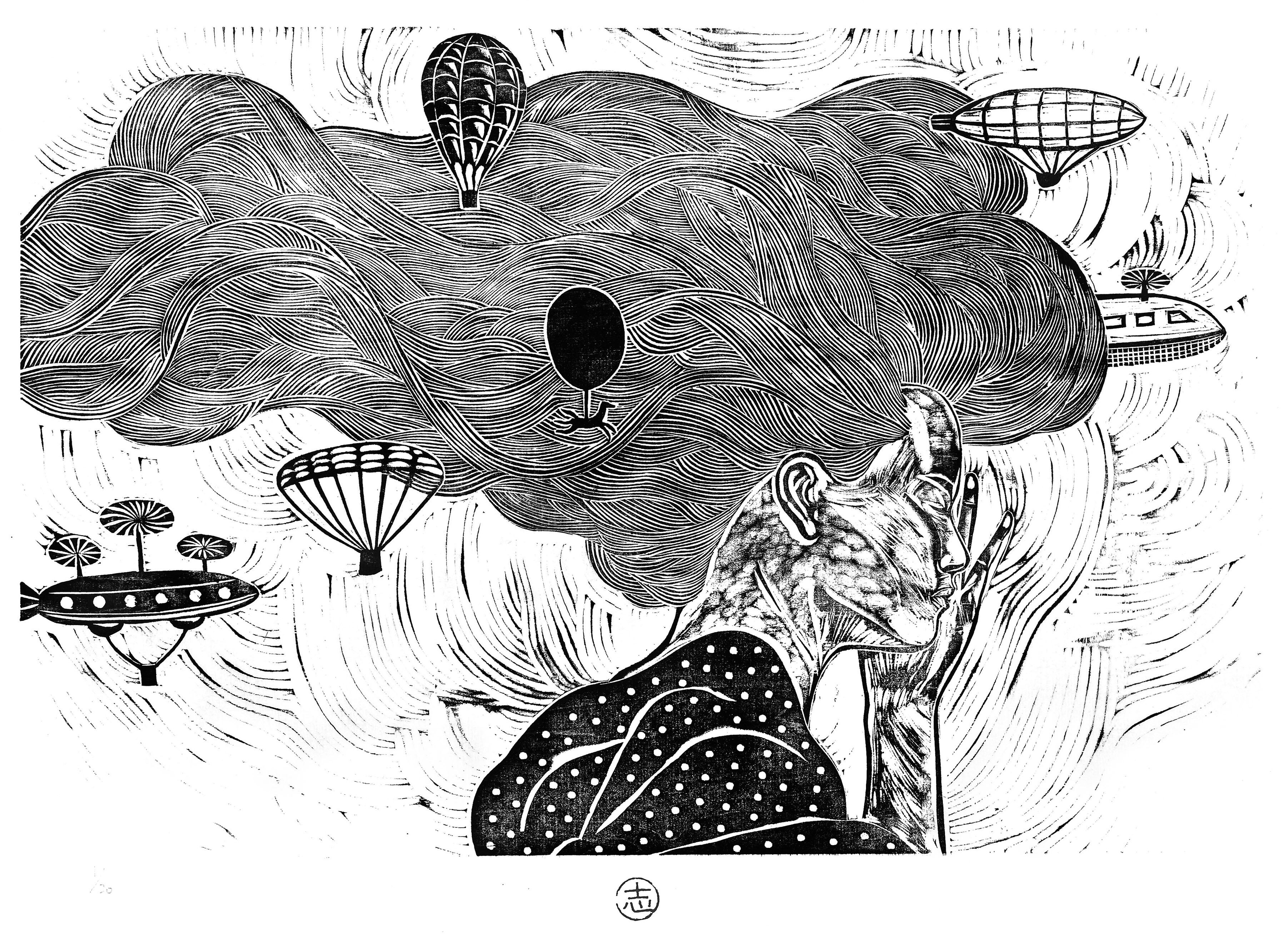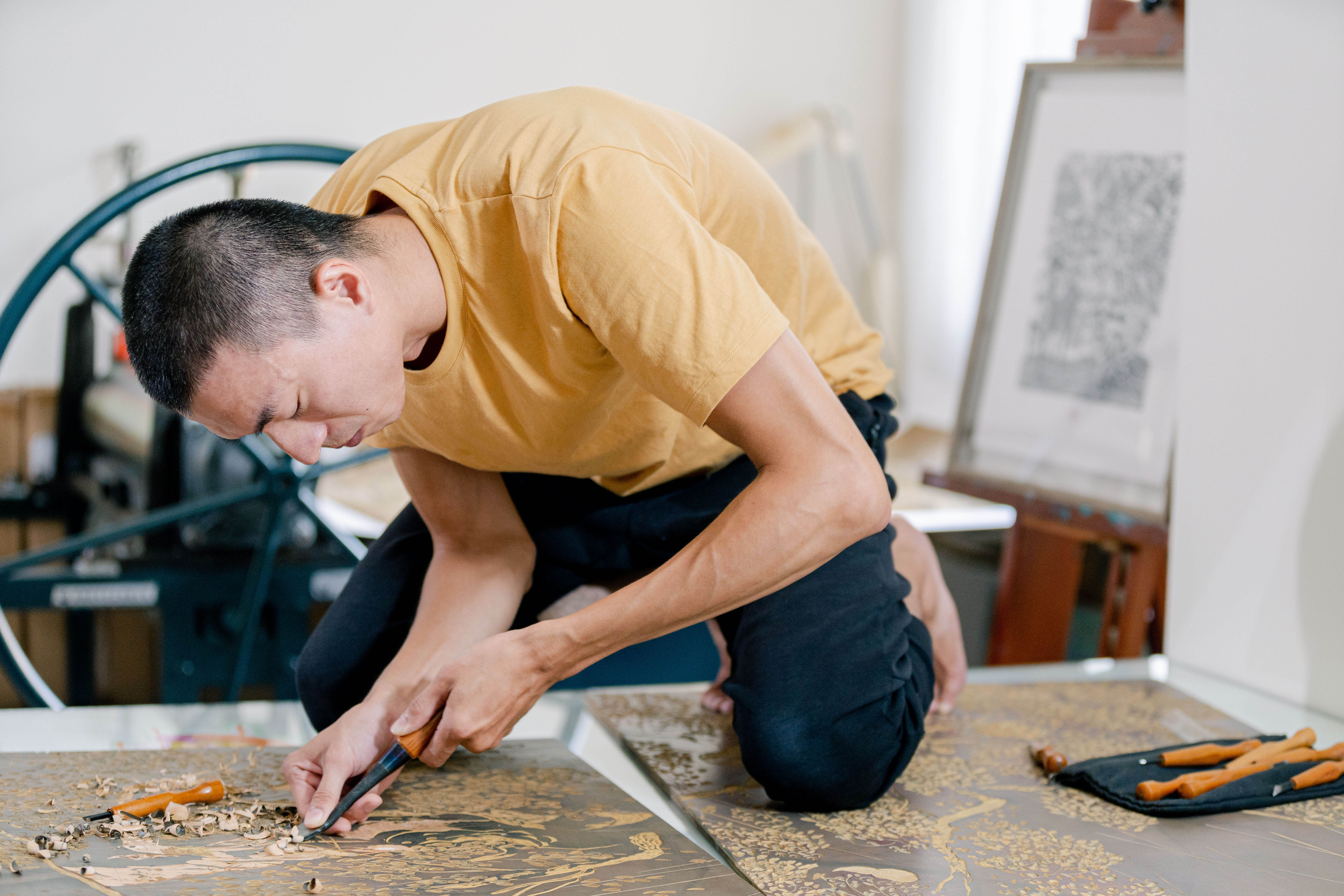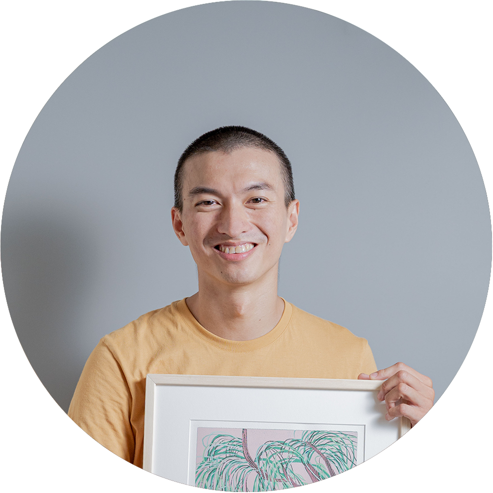 採訪安排在9月初,雖然時序已經進入秋天,但台中的天氣仍然很炎熱。在沒有安裝冷氣的工作空間裡,沐冉整個人盤坐在工作桌上,做出如同瑜伽伸展般的姿勢俯身雕刻,為我們示範刷染油墨、版畫壓印的過程。他說,版畫印製適合在又濕又冷的冬天,油墨才不會乾得太快,所以過程中,我們看他搶在油墨乾掉之前反覆壓印,連擦汗的時間都沒有;在等待宣紙吸收水分浸潤的時間裡,又像女孩子在敷面膜,只能泡個茶靜靜地等待。創作過程中,身體跟氣候、環境有很多互動跟呼應,「有點像農夫,也需要看天做事。」