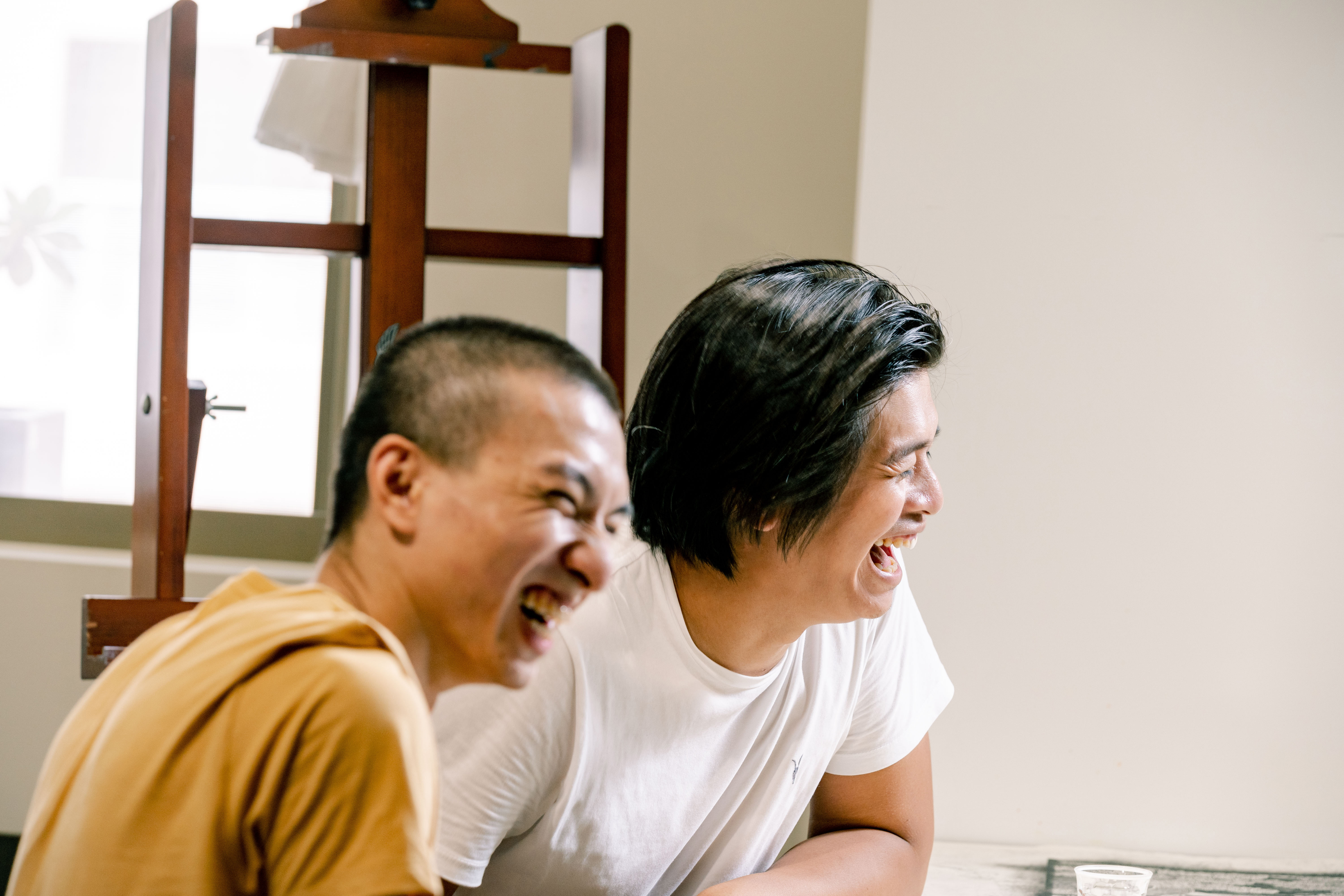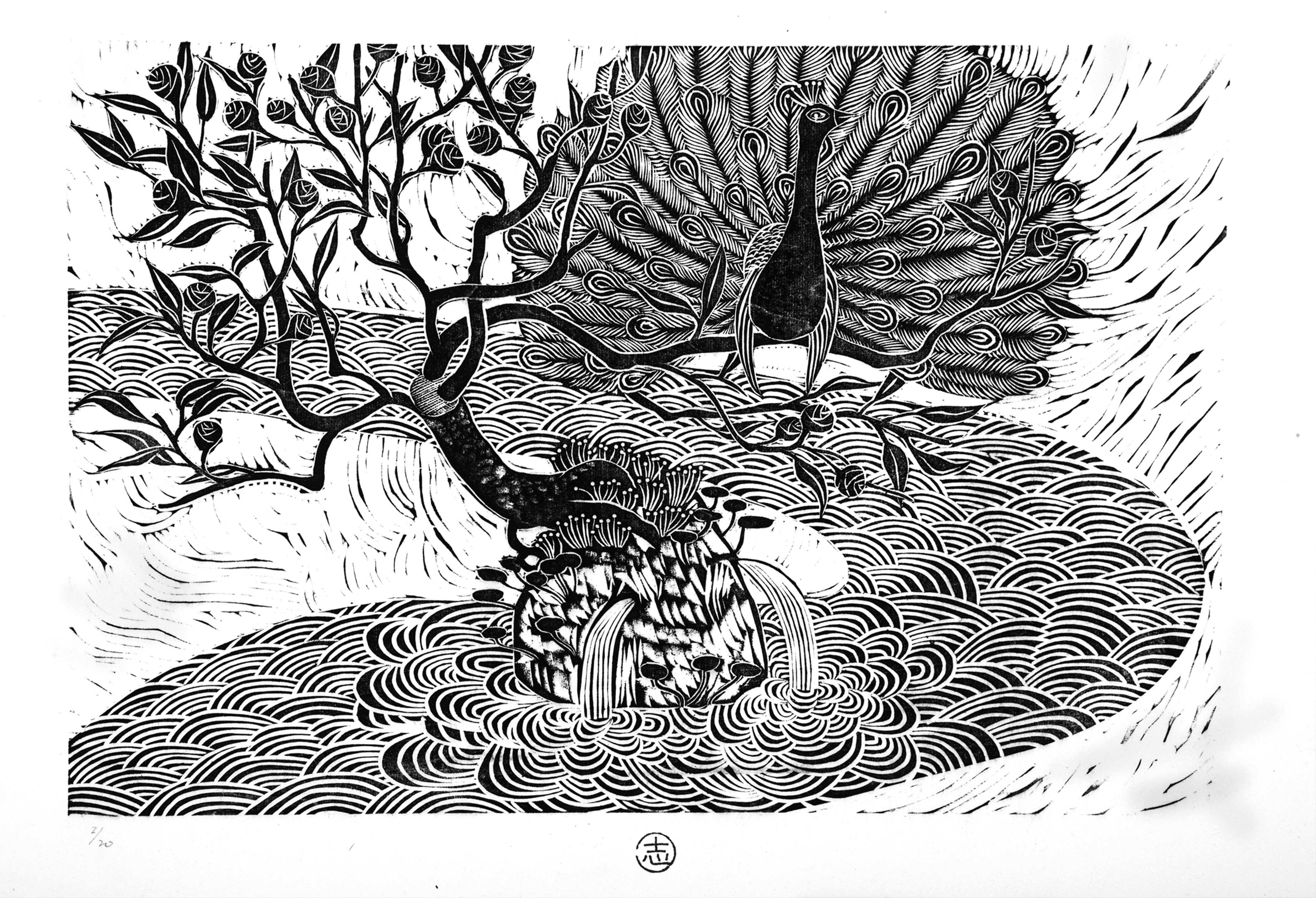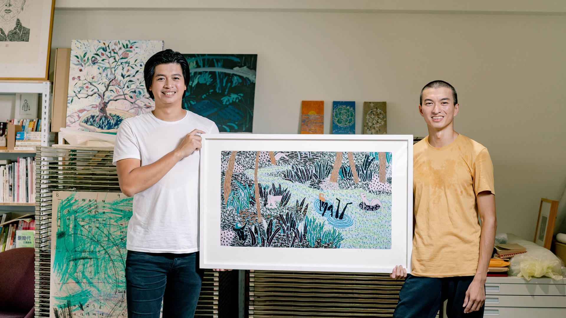 採訪安排在9月初,雖然時序已經進入秋天,但台中的天氣仍然很炎熱。在沒有安裝冷氣的工作空間裡,沐冉整個人盤坐在工作桌上,做出如同瑜伽伸展般的姿勢俯身雕刻,為我們示範刷染油墨、版畫壓印的過程。他說,版畫印製適合在又濕又冷的冬天,油墨才不會乾得太快,所以過程中,我們看他搶在油墨乾掉之前反覆壓印,連擦汗的時間都沒有;在等待宣紙吸收水分浸潤的時間裡,又像女孩子在敷面膜,只能泡個茶靜靜地等待。創作過程中,身體跟氣候、環境有很多互動跟呼應,「有點像農夫,也需要看天做事。」